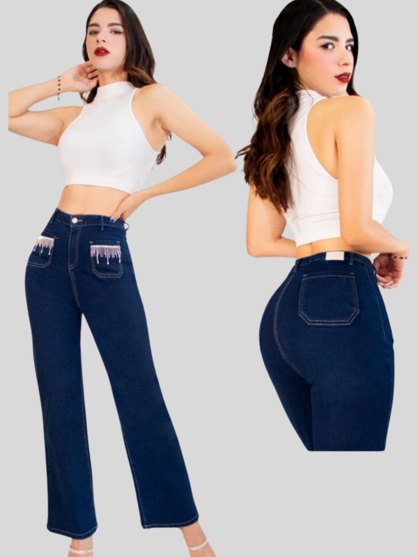 Valorado en 0 de 5$315.00 Seleccionar opciones Este producto tiene múltiples variantes. Las opciones se pueden elegir en la página de productoPantalones acampanados azul oscuro con detalles brillantes