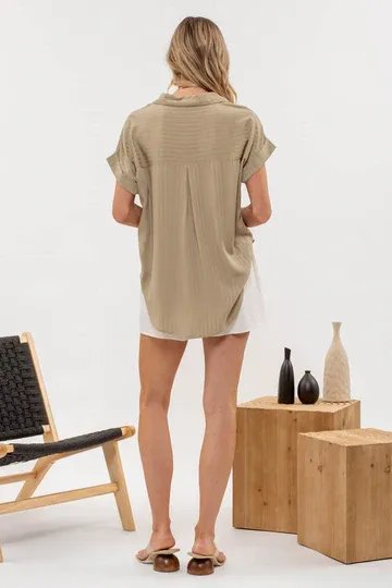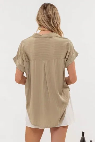 Blusa oversize de manga corta con elegantes rayas verticales en tono verde olivo, perfecta para un look casual sofisticado