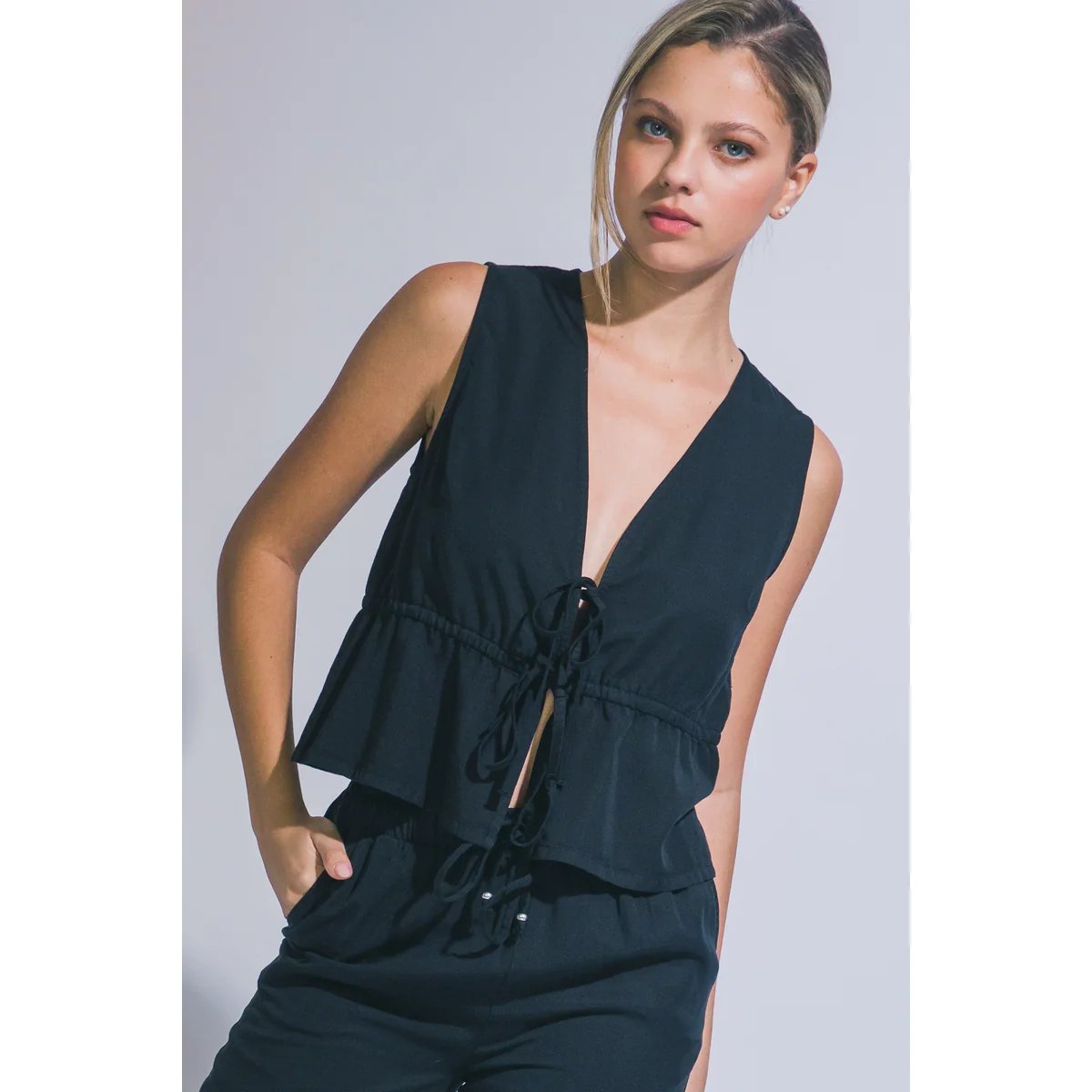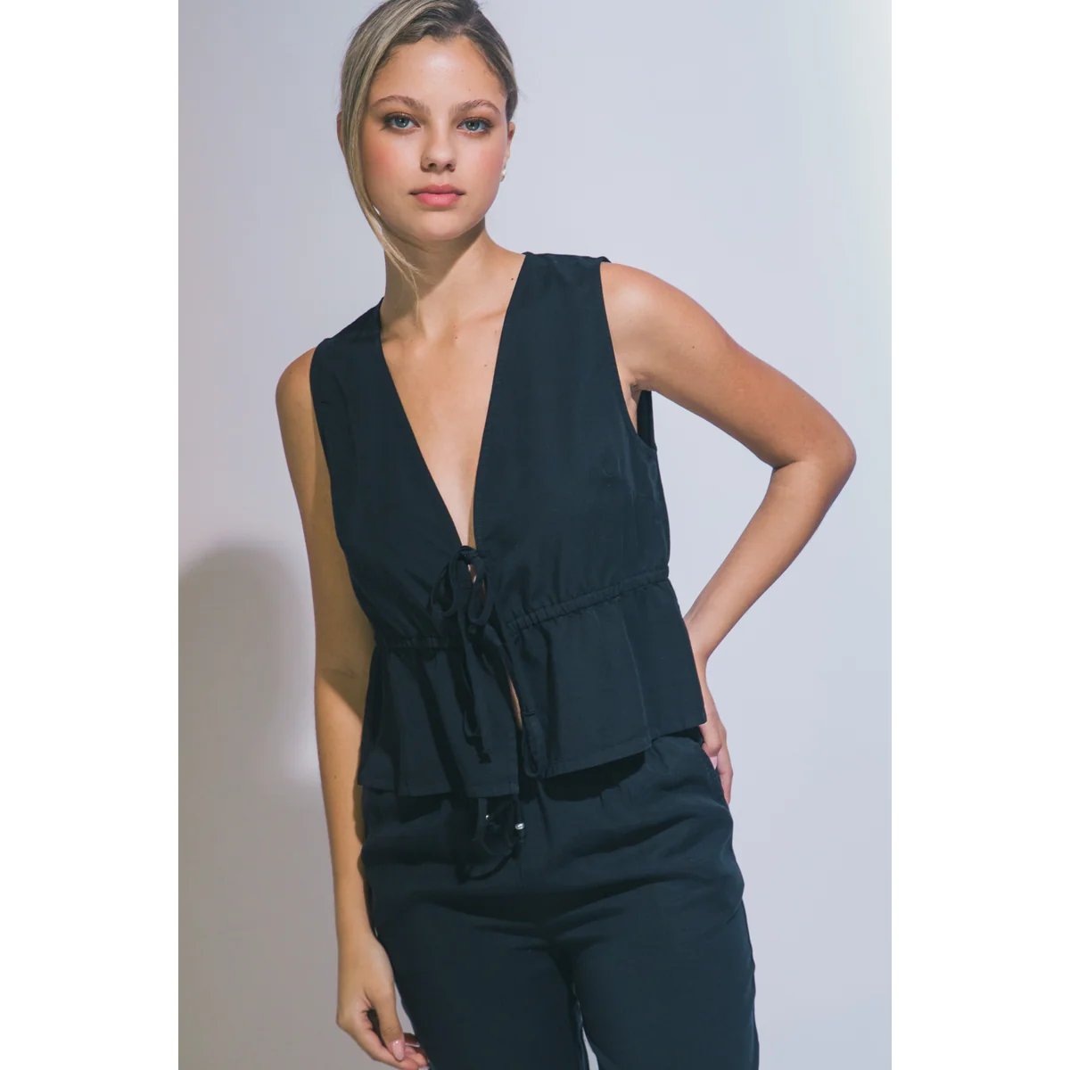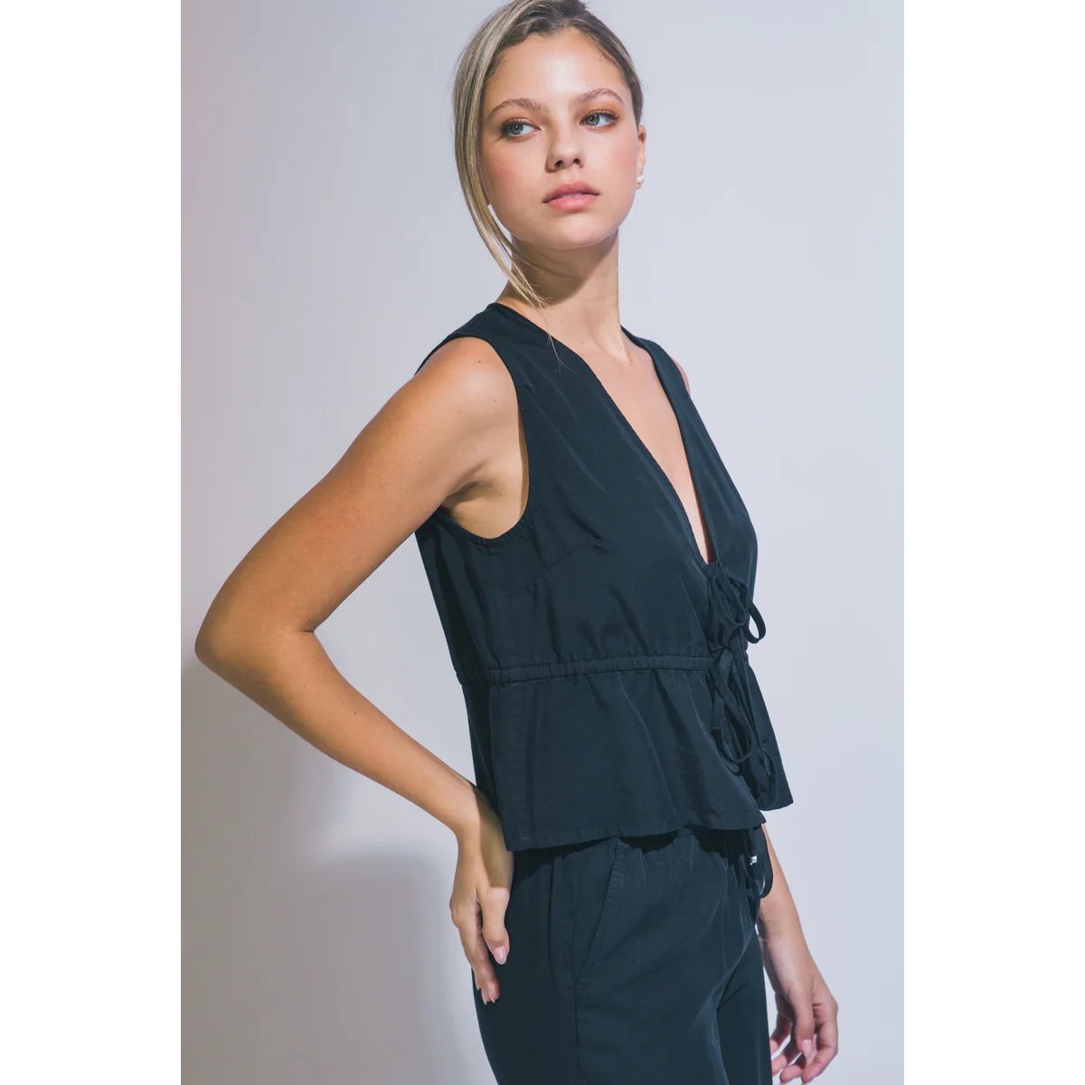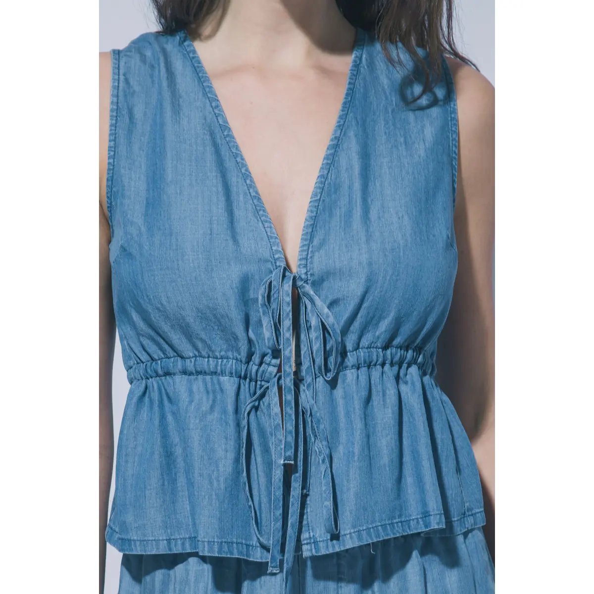 Chaleco denim con cintas ajustables en cintura y escote en V profundo. Estilo bohemio casual perfecto para cualquier ocasión