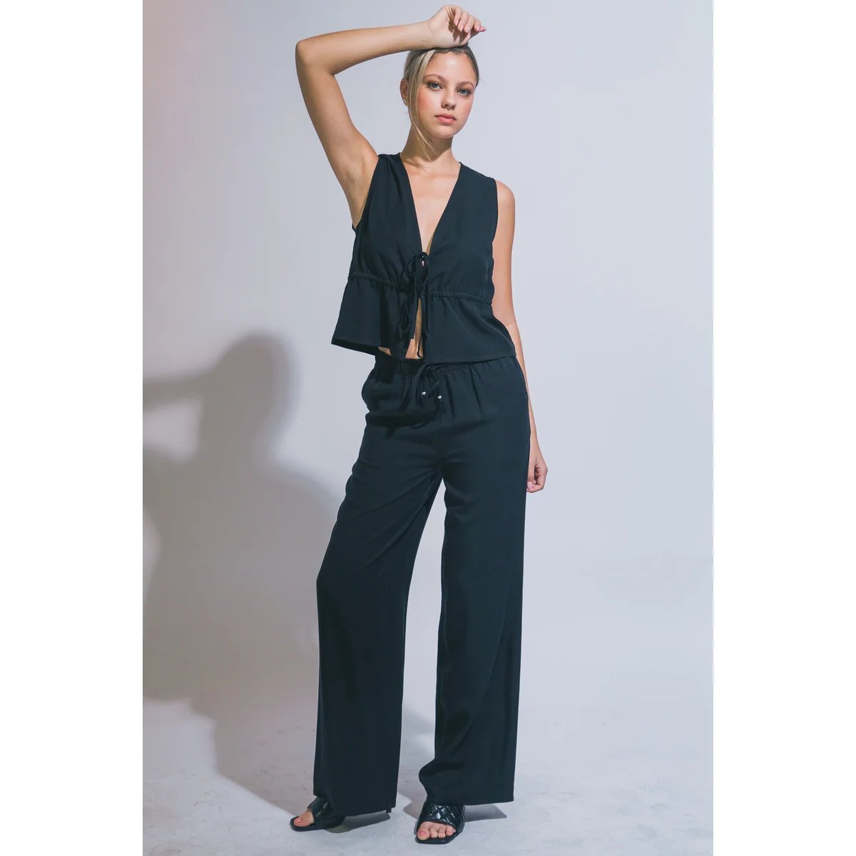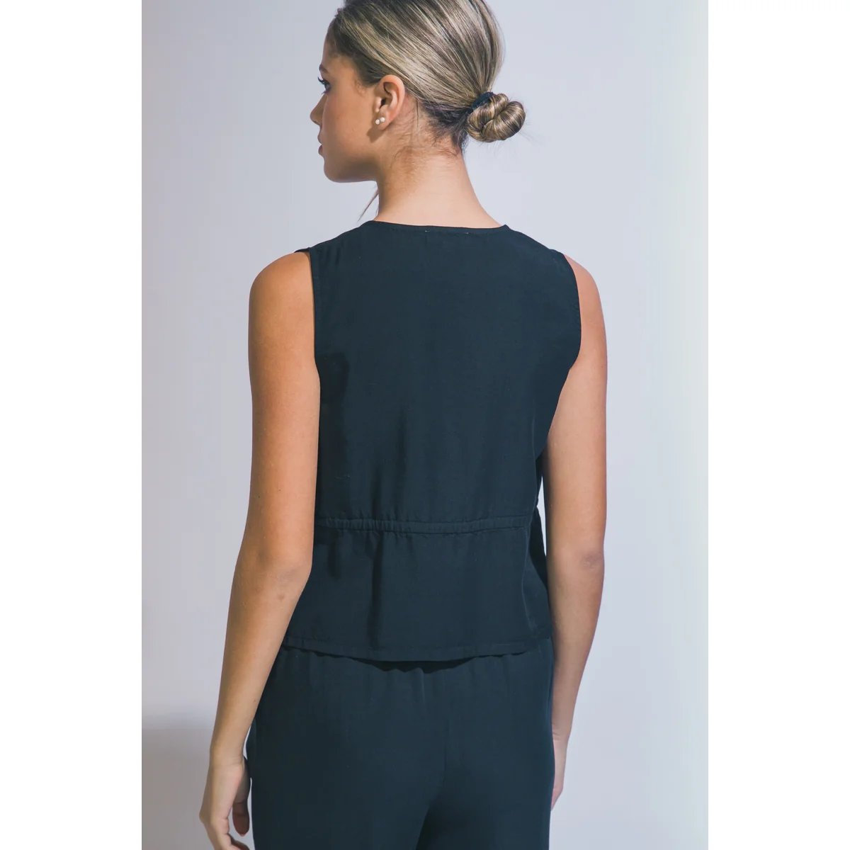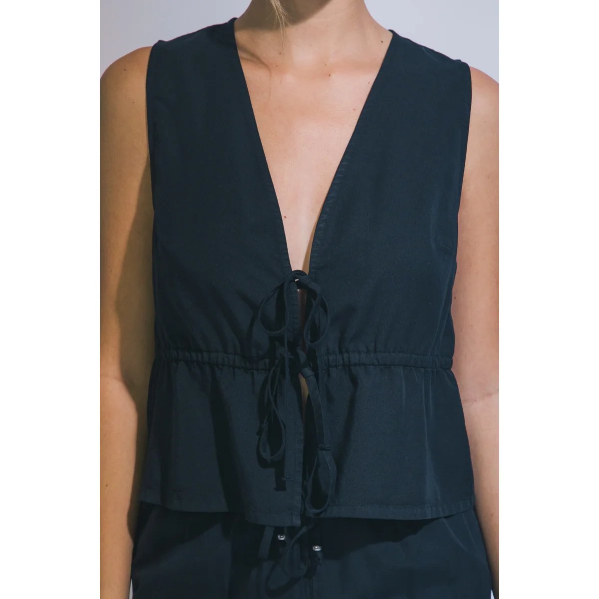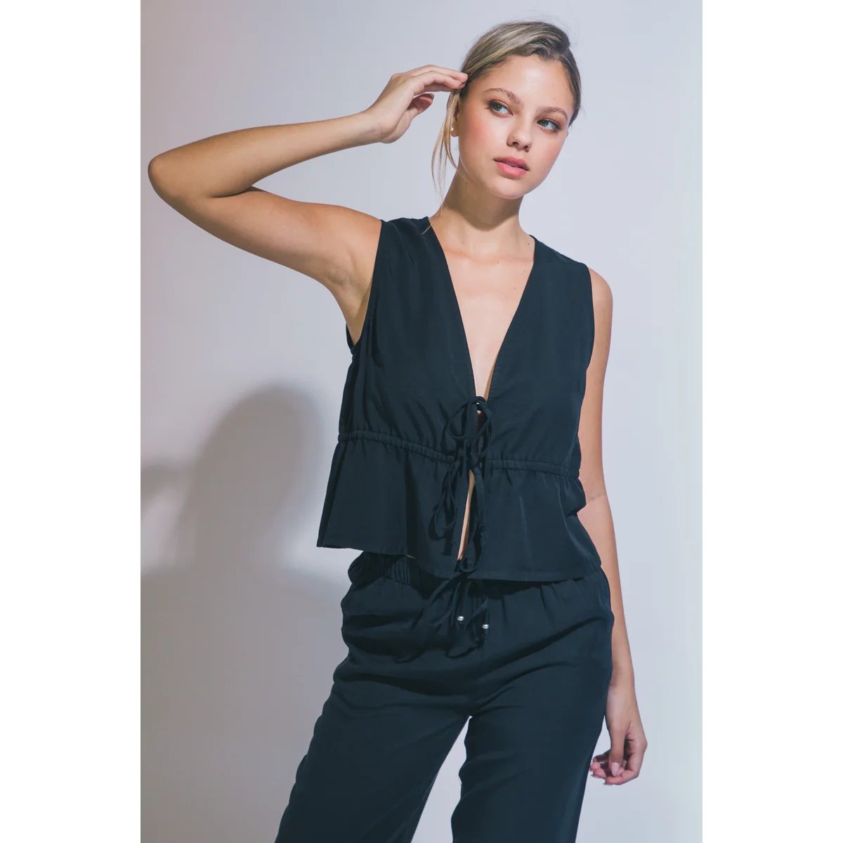 Chaleco denim con cintas ajustables en cintura y escote en V profundo. Estilo bohemio casual perfecto para cualquier ocasión