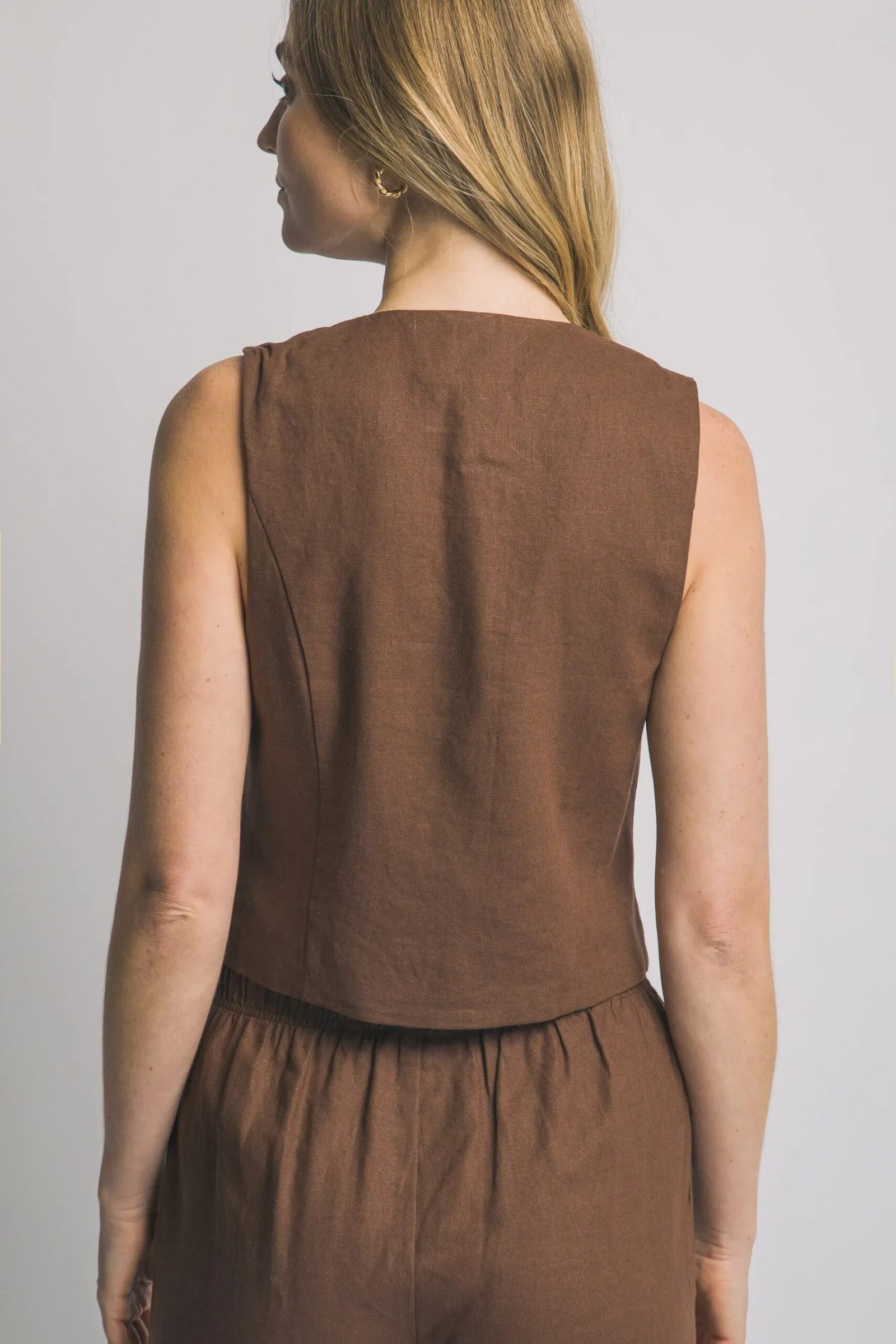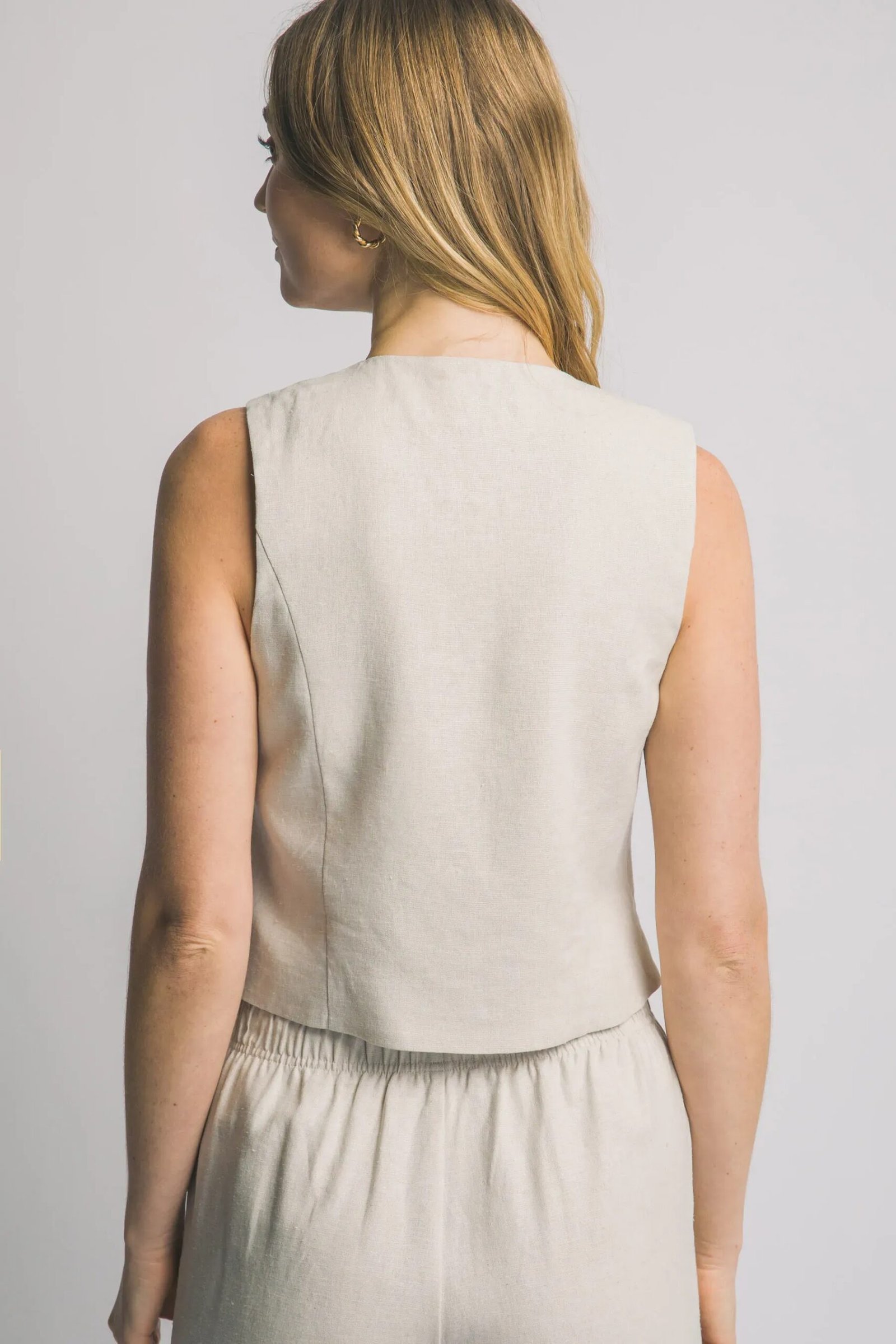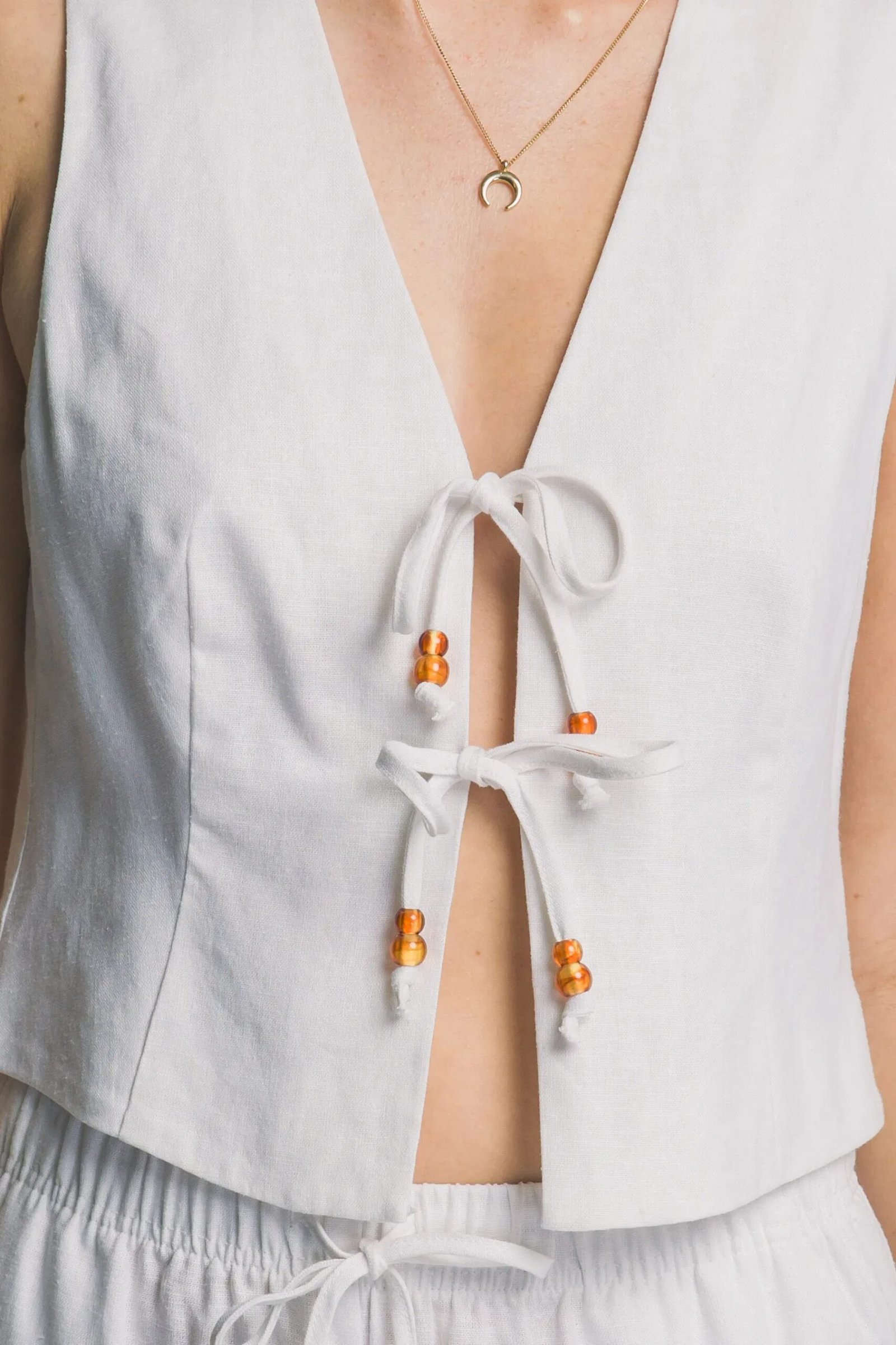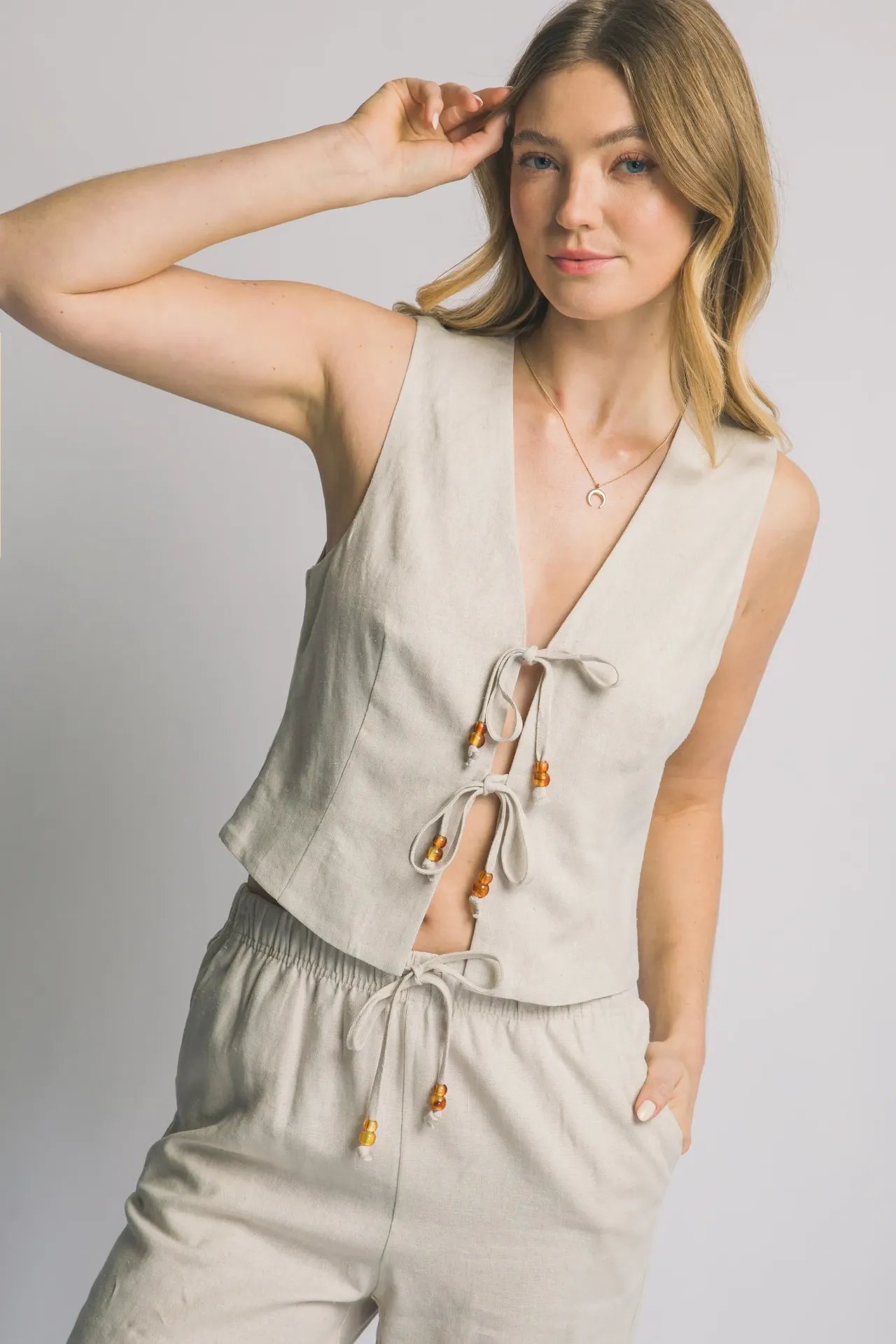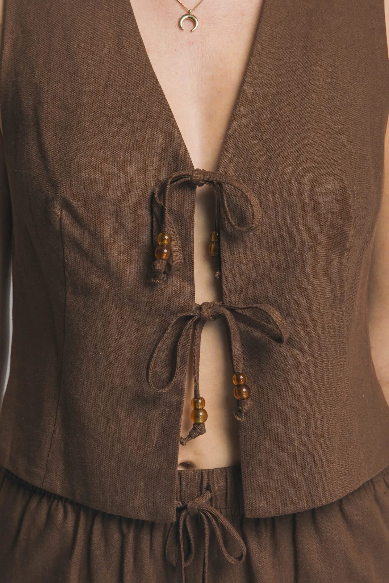 Chaleco cruzado de lino natural con cordones decorativos, perfecto para looks elegantes y versátiles de verano