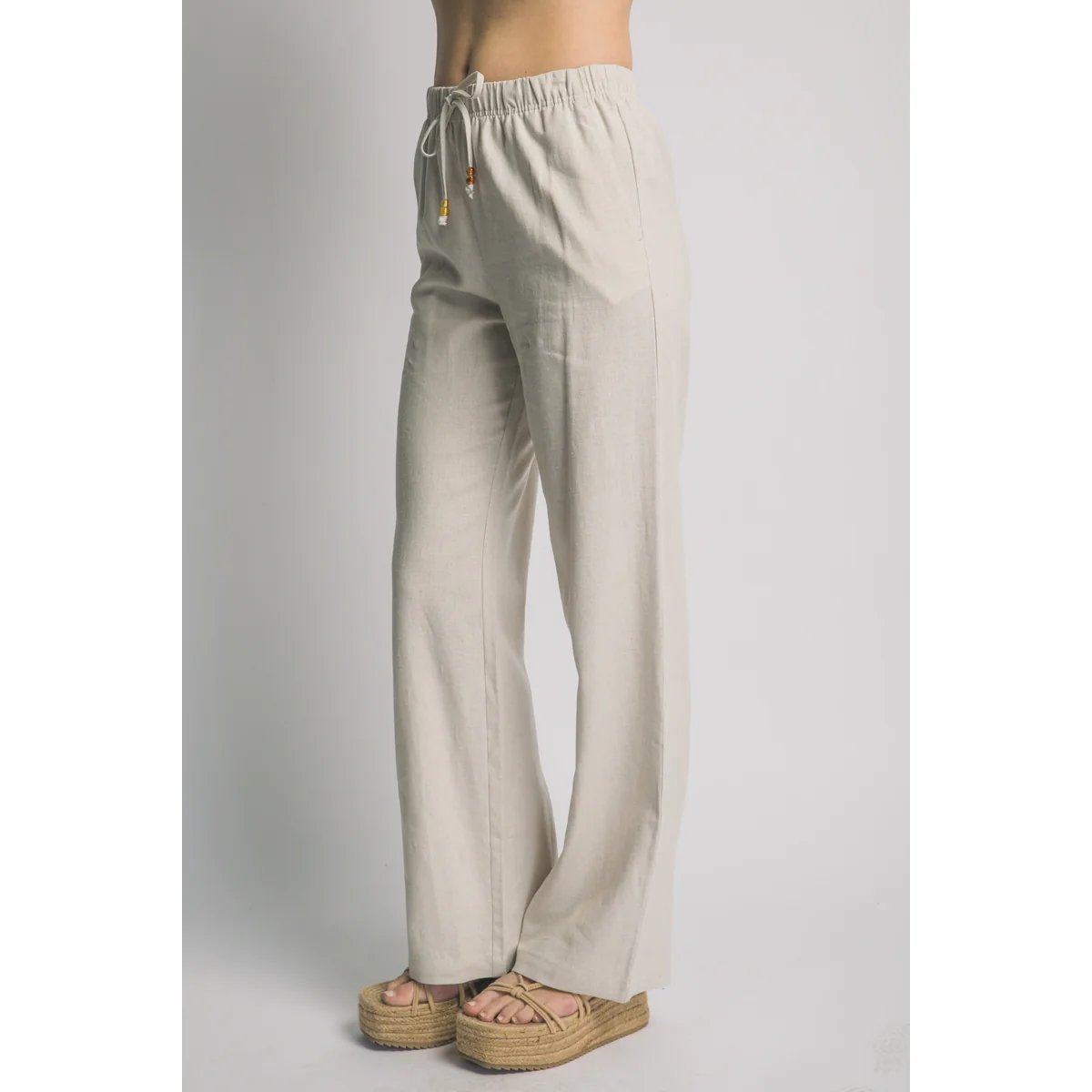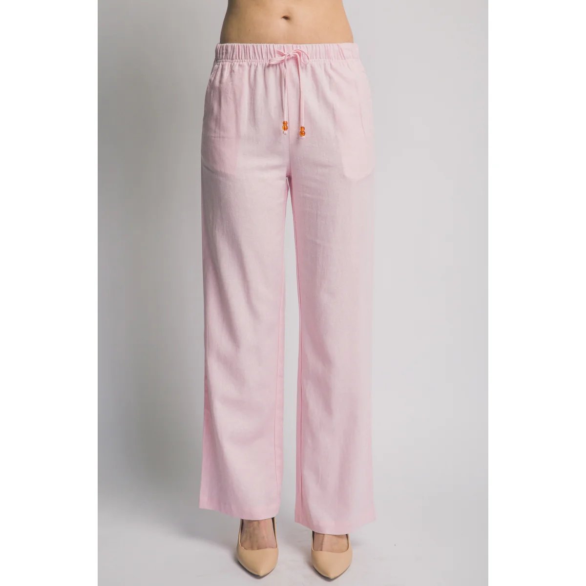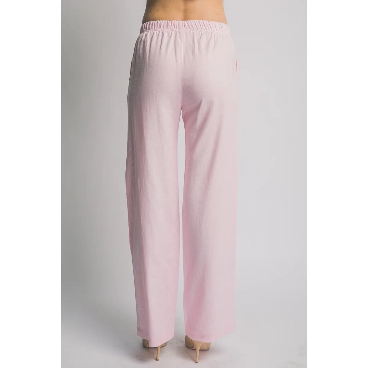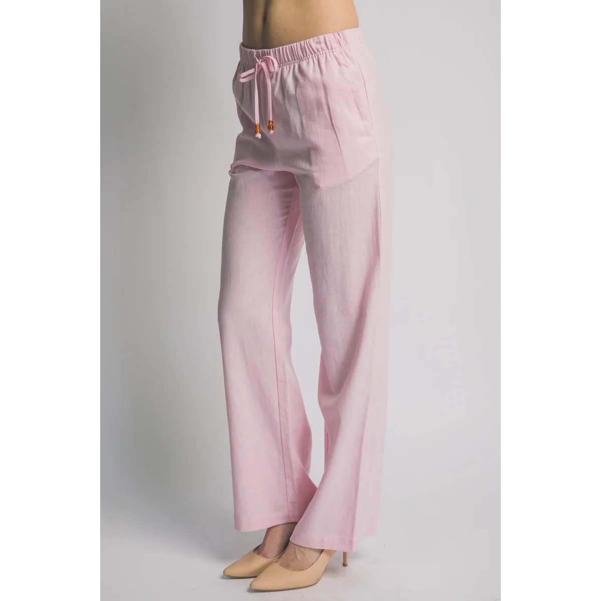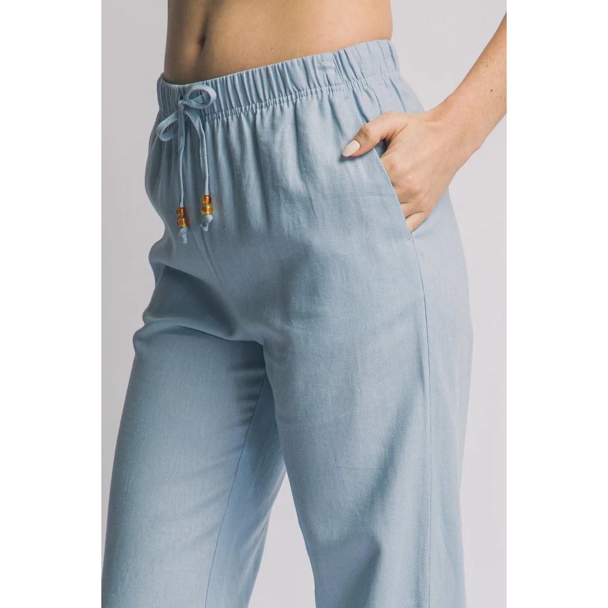 Pantalón palazzo de lino azul claro con cordón ajustable. Comodidad y estilo bohemio en una prenda versátil