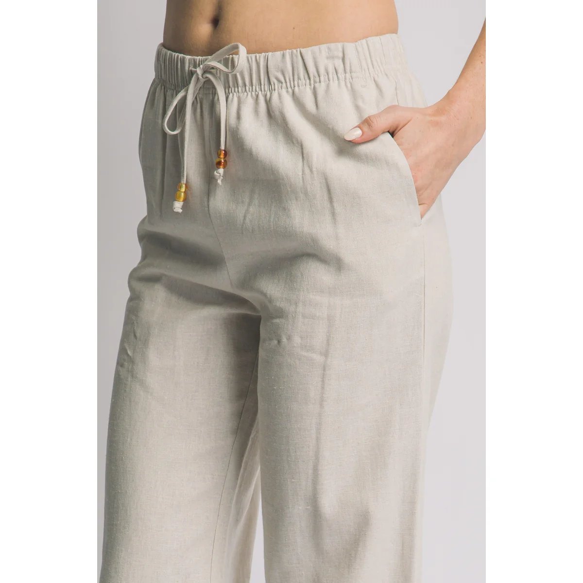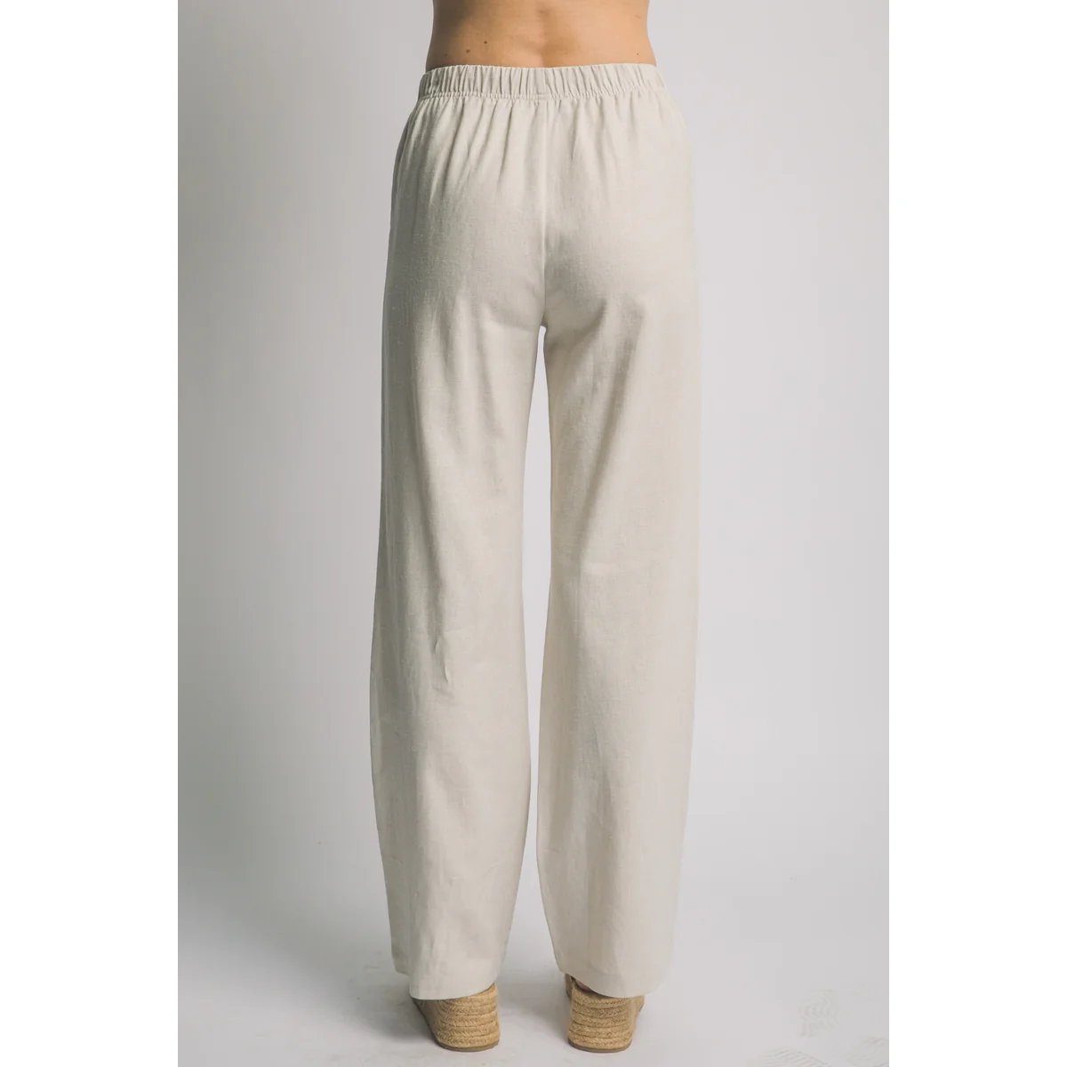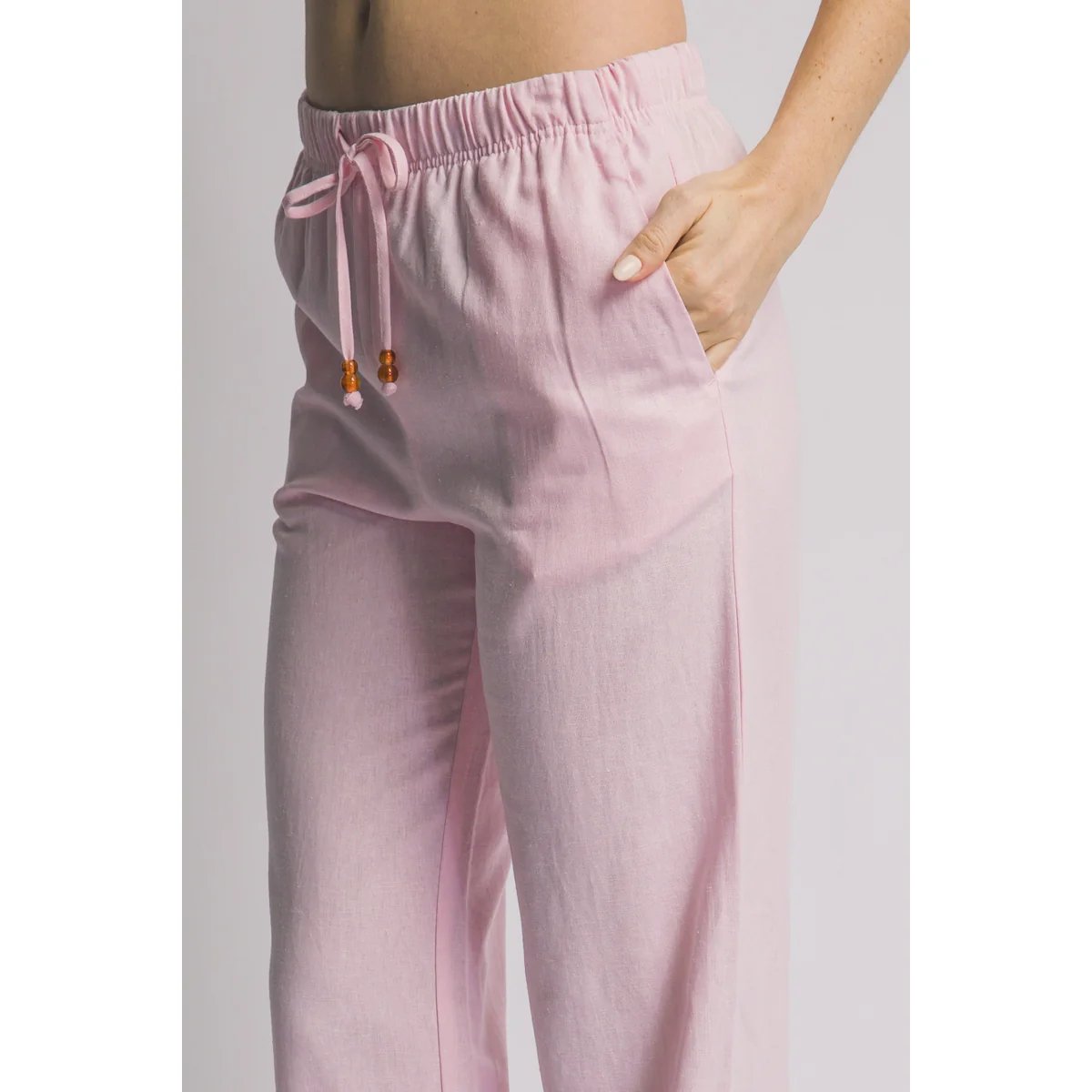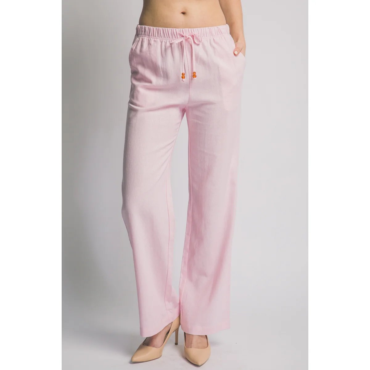 Pantalón palazzo de lino azul claro con cordón ajustable. Comodidad y estilo bohemio en una prenda versátil
