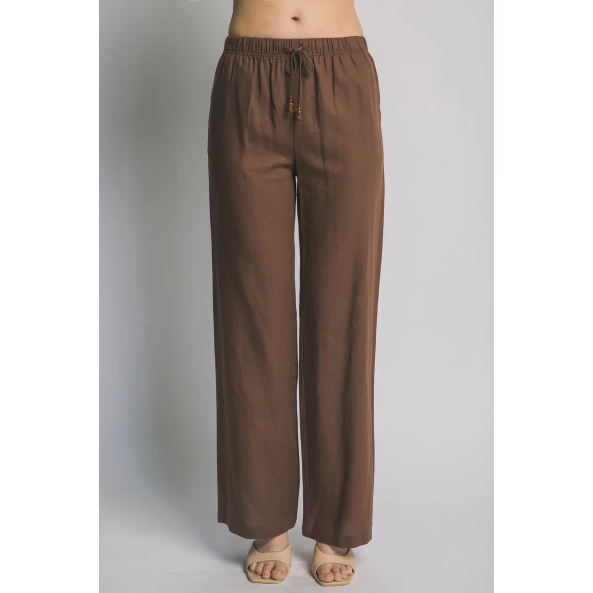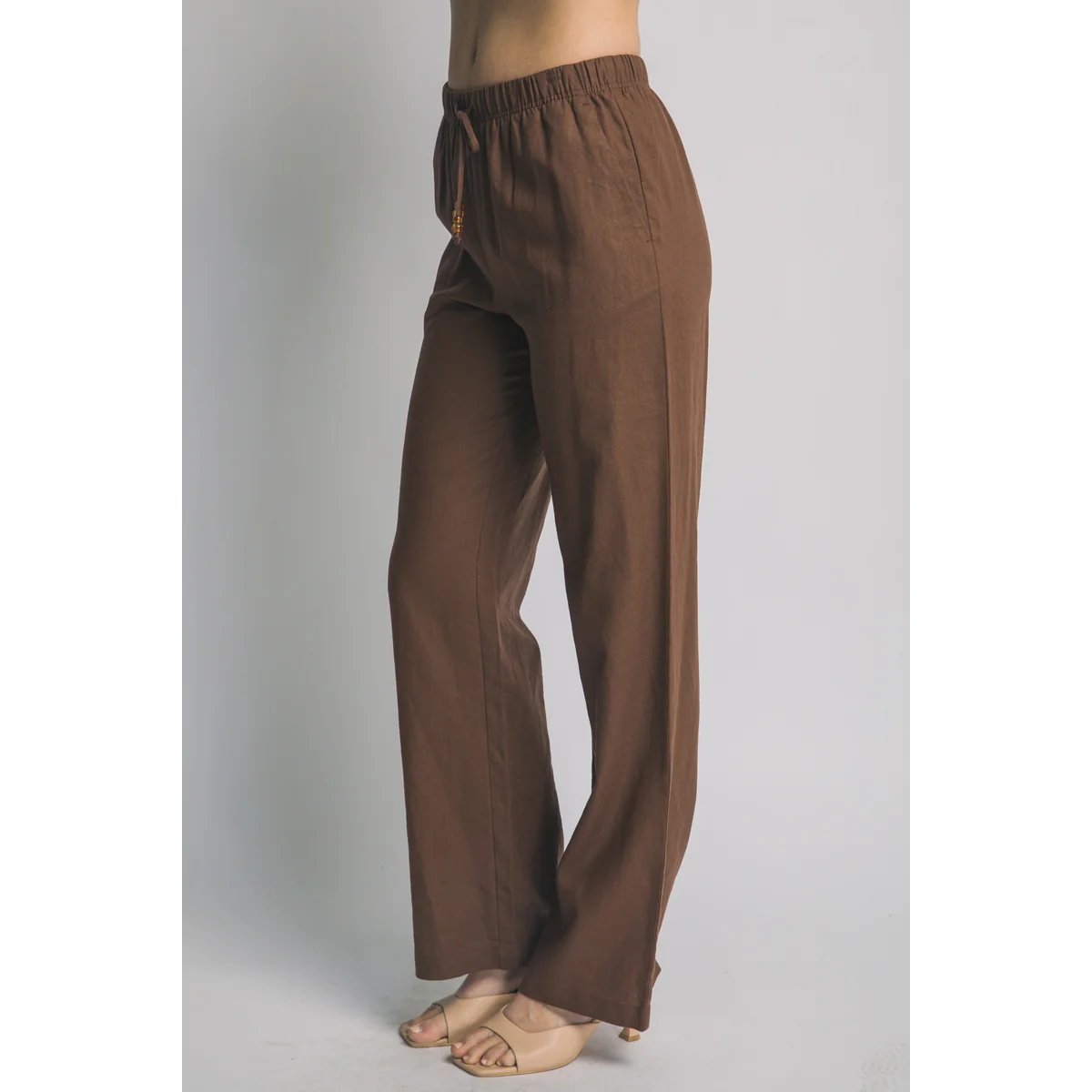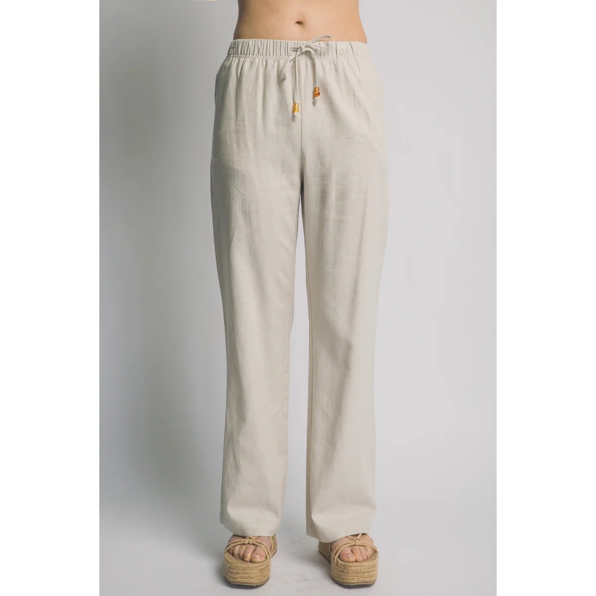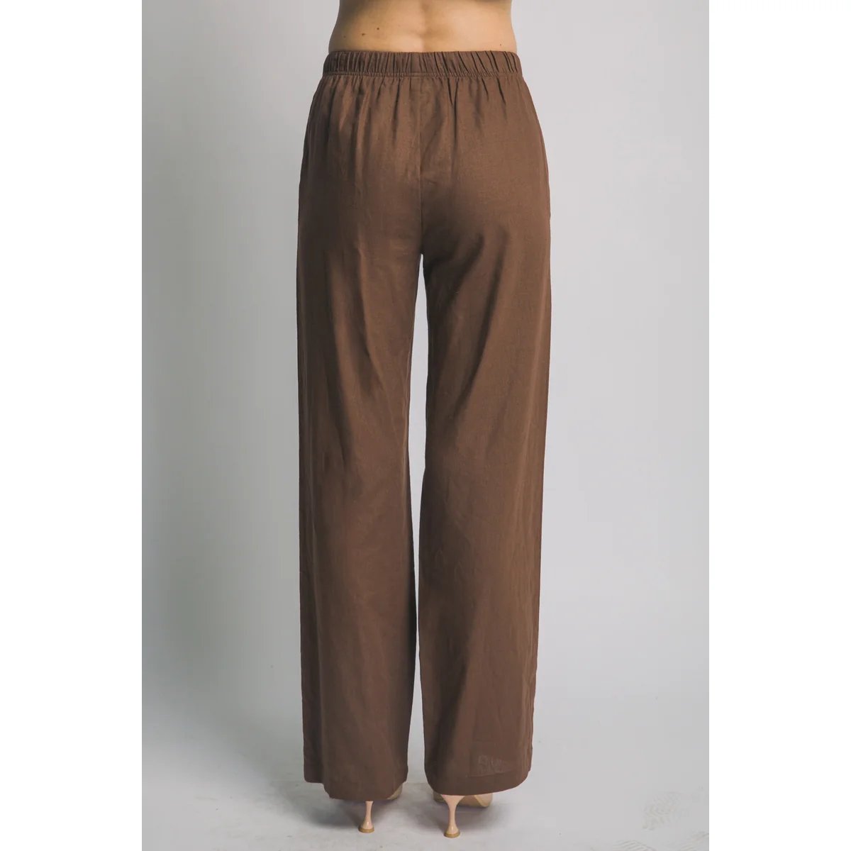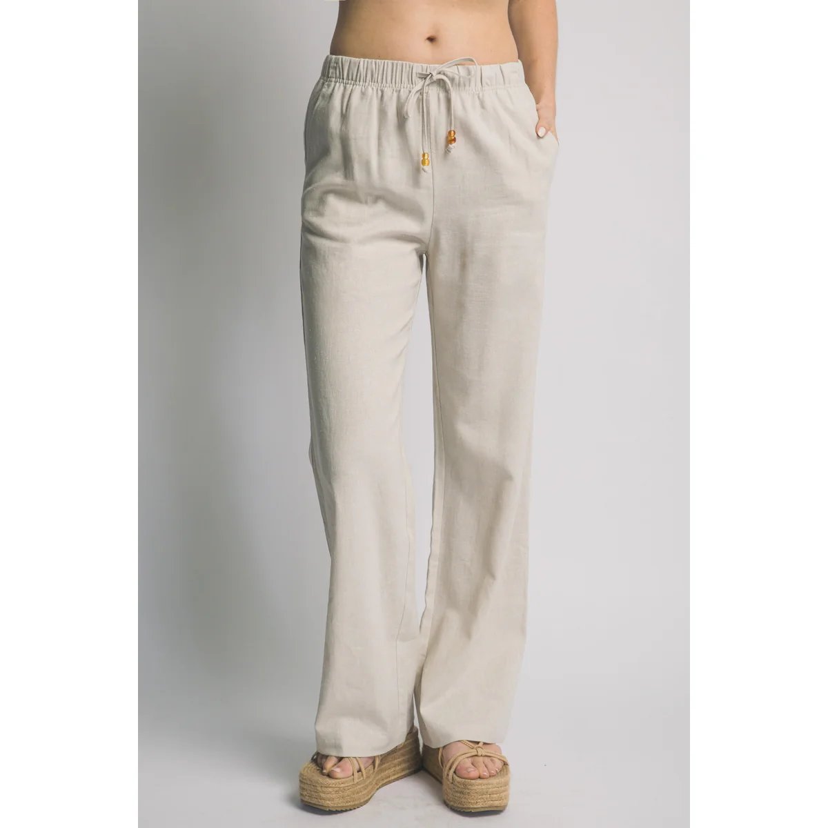 Pantalón palazzo de lino azul claro con cordón ajustable. Comodidad y estilo bohemio en una prenda versátil