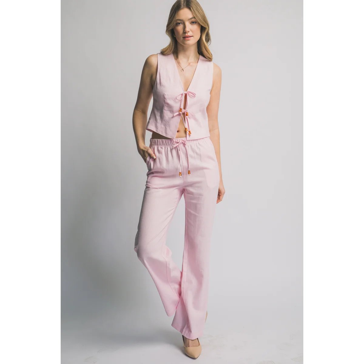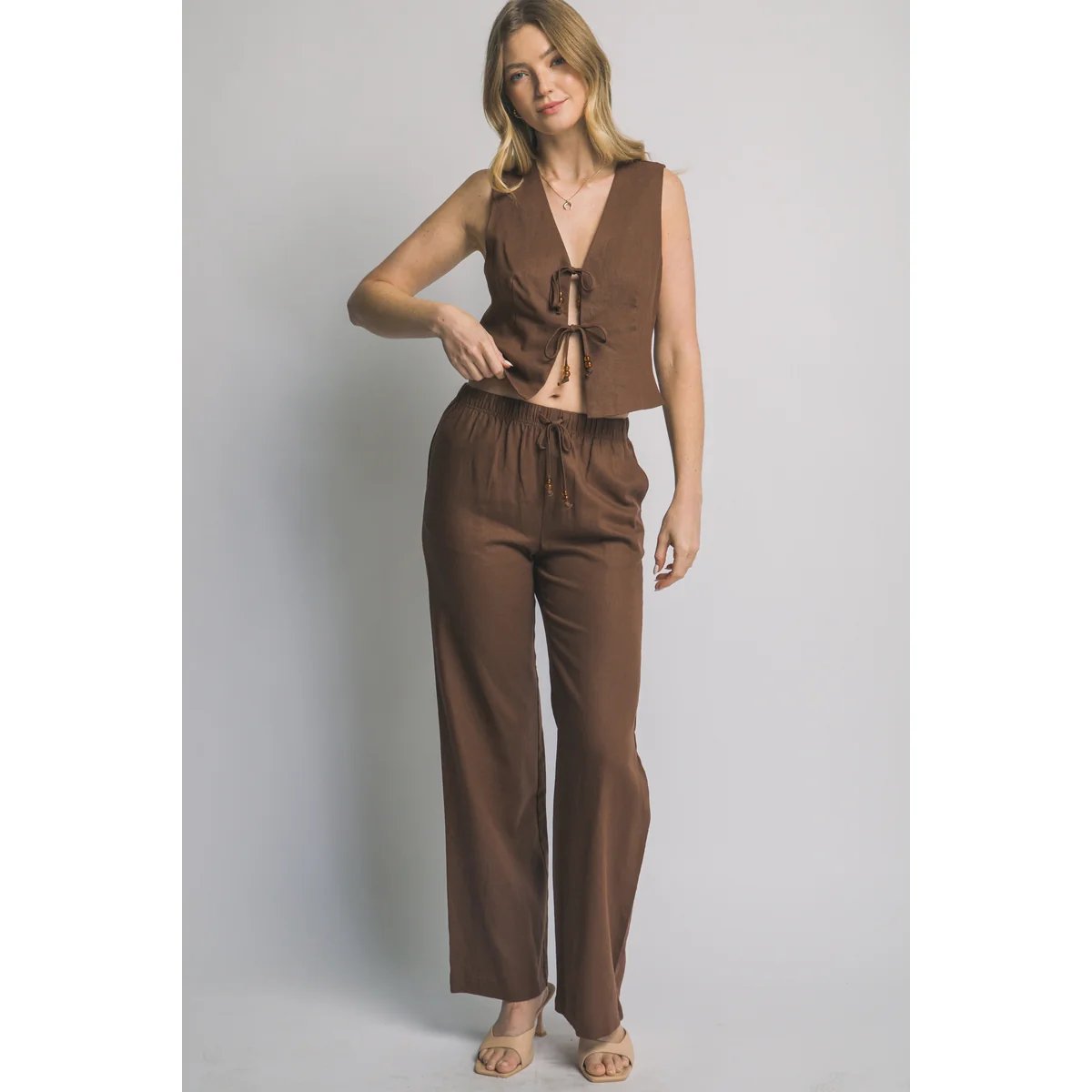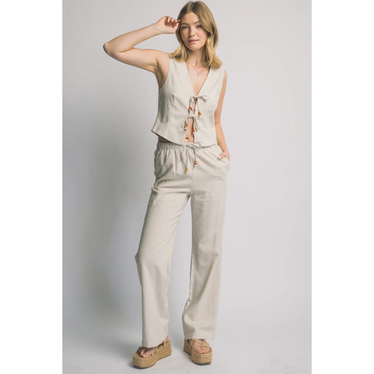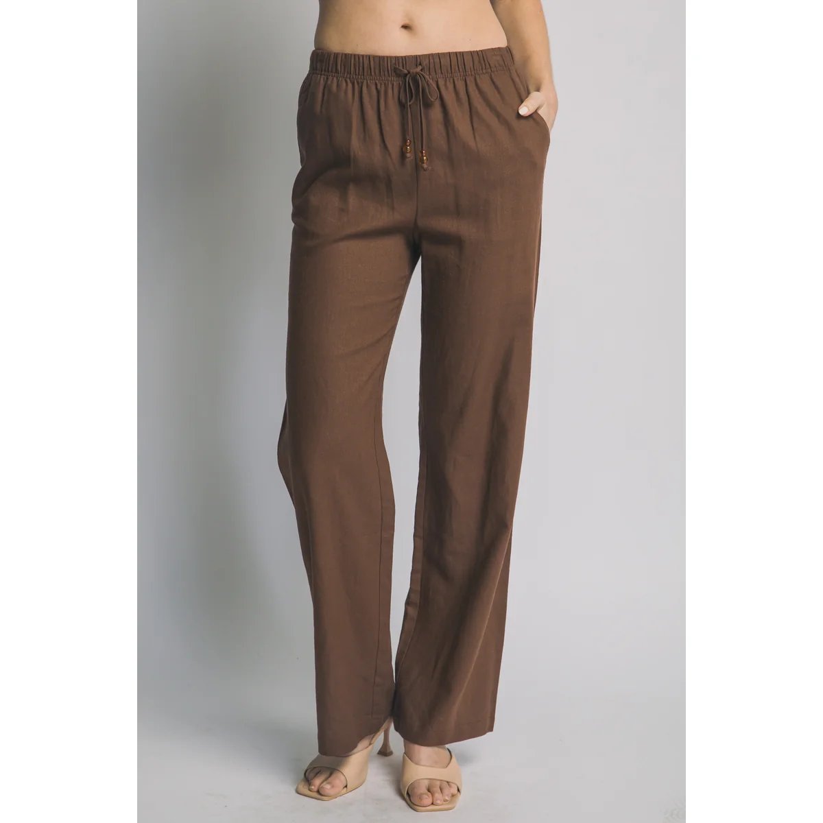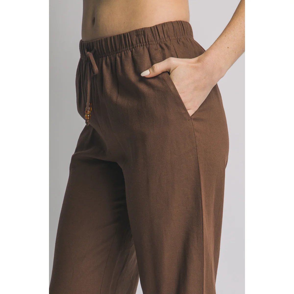 Pantalón palazzo de lino azul claro con cordón ajustable. Comodidad y estilo bohemio en una prenda versátil