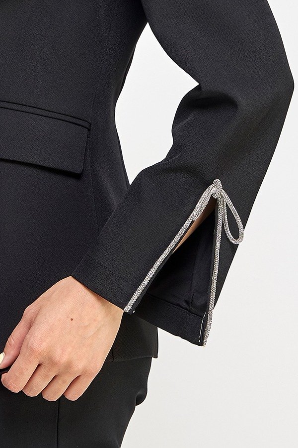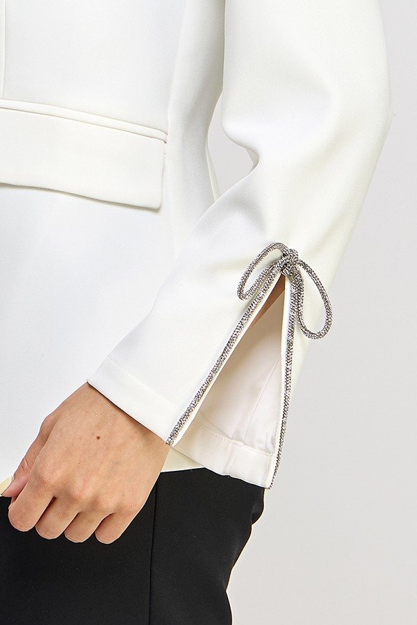 Este saco blanco es la pieza estrella para un look elegante, moderno y con presencia. Su diseño clásico con solapa estructurada se combina con un detalle brillante en las mangas que le da un giro glam y sofisticado. Perfecto para juntas, cenas o eventos especiales.