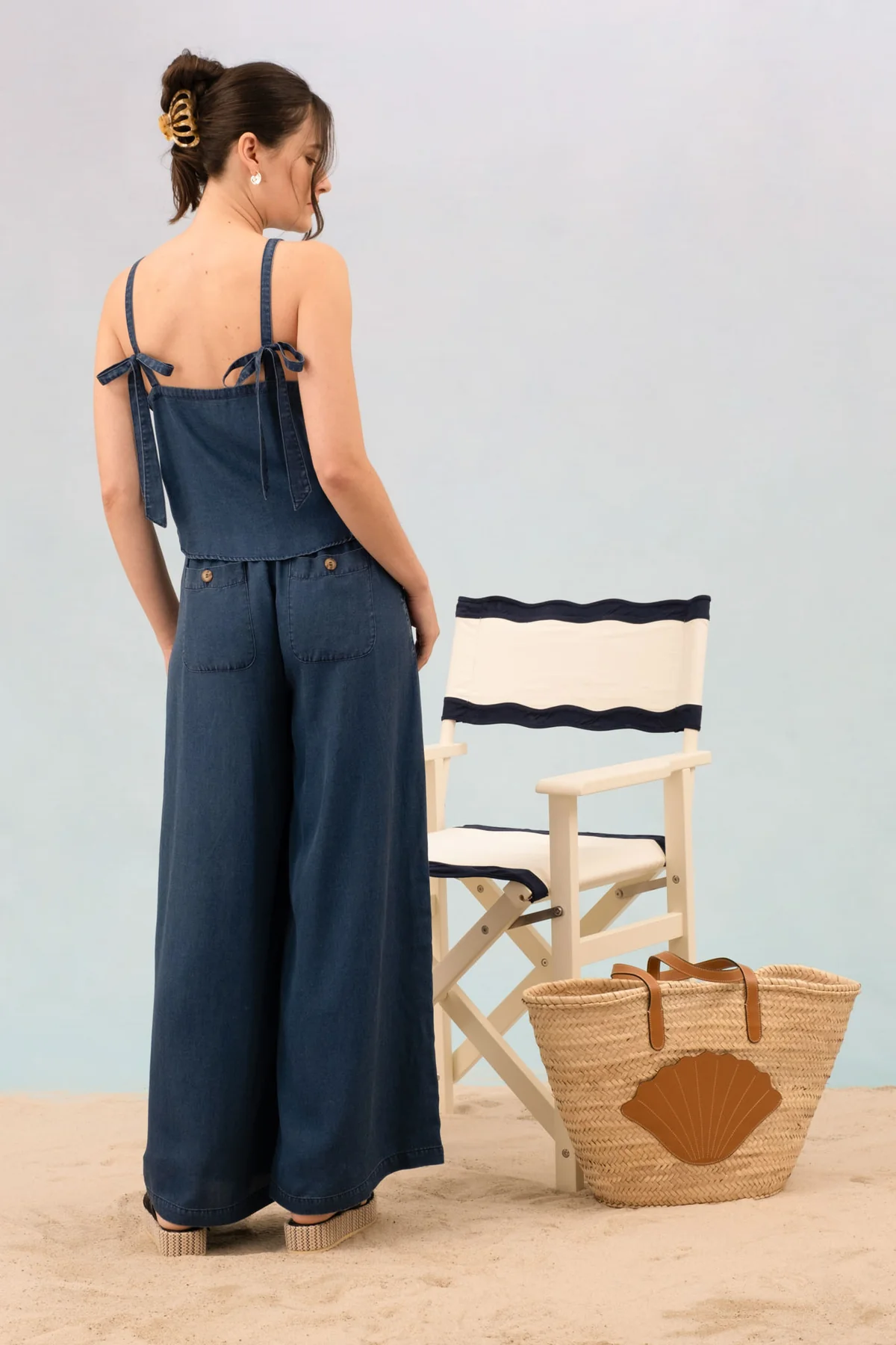 Este top de mezclilla con tirantes ajustables es perfecto para lucir fresca y con estilo durante todo el día. Fabricado en un tejido ligero que brinda comodidad y permite una gran libertad de movimiento, su corte suelto realza tu figura sin sacrificar confort. Gracias a los lazos en la espalda, puedes personalizar el ajuste para mayor seguridad, lo que te permitirá llevarlo tanto en planes informales como en salidas con amigos. Además, su acabado denim suave le da un aire desenfadado, ideal para combinaciones veraniegas con shorts o faldas, o para looks más urbanos con pantalones. Con detalles minimalistas, este top se convertirá en uno de tus básicos preferidos para la temporada, ofreciendo versatilidad y un toque juvenil que se adapta a tu día a día.